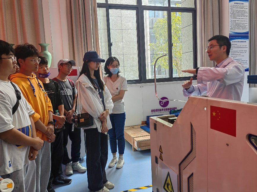 郭训忠教授的柔性成型技术与装备实验室内仪器先进、种类多样,在感受柔性成型技术的先进与奇妙的同时,同学们了解到柔性成型技术设备利用率高、生产能力更为稳定、产品质量高以及显著经济效益等优势,同学们对柔性成型技术有了更深的了解。