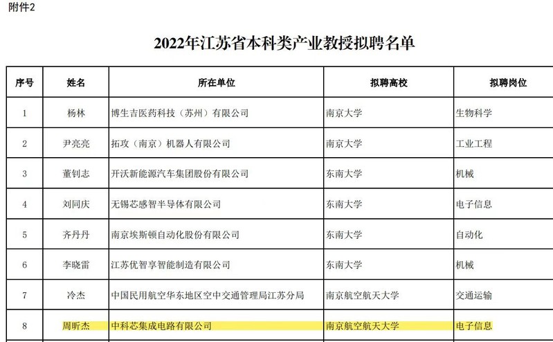 2022年9月21日,江苏省教育厅公示了2022年江苏省产业教授(兼职)选聘结果,我院推荐的中科芯集成电路有限公司通用技术研究室主任周昕杰成功入选本科类产业教授拟聘名单。