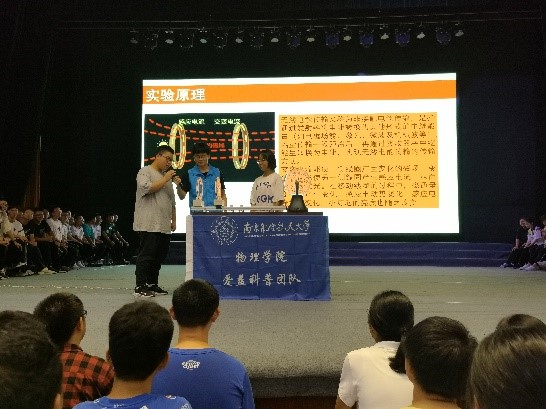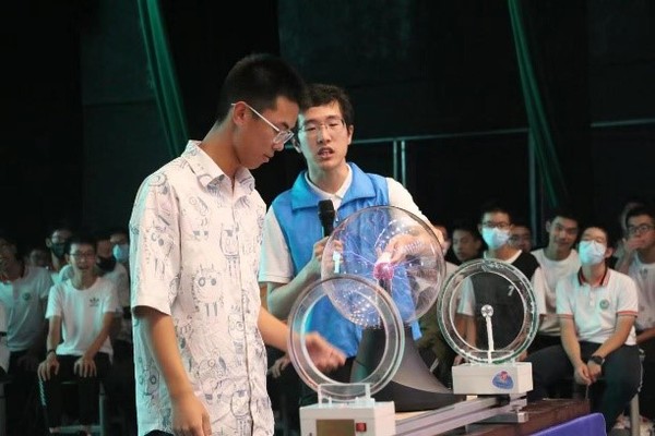 “爱益科普”讲解团成员向现场学生重现了辉光球、浮沉子、无线充电等三个经典物理实验。讲解团成员讲述了经典实验的“前世今生”、实验原理及在各个应用领域发挥的作用,同时邀请中学生上台感受实验,激发了现场学生对物理基础学科的兴趣。