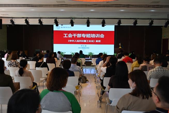9月29日下午,校工会在西苑教工活动中心501多功能厅举办了工会干部专题培训会,学习新修改的《中华人民共和国工会法》。全体专职工会干部、校院两级工会主席、工会委员,以及教职工诉求联络员代表参加培训。会议由校工会常务副主席余春玲主持。
