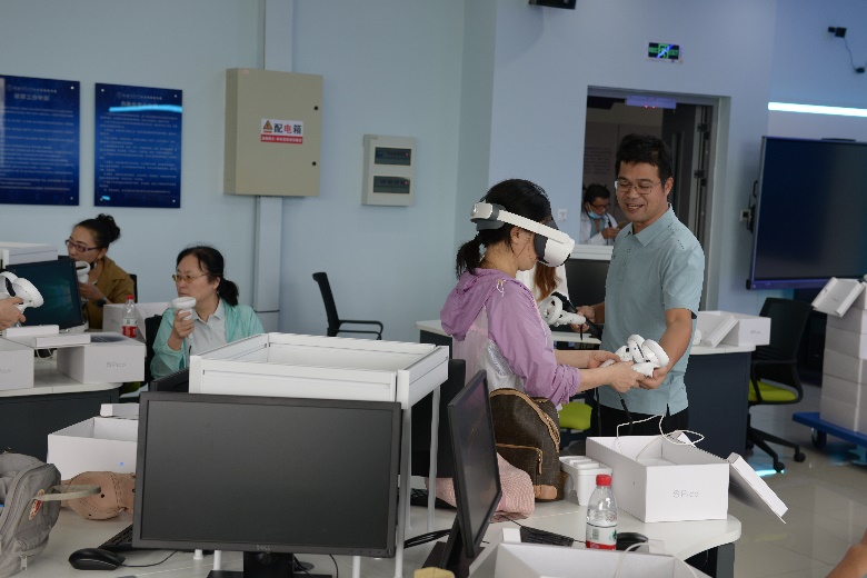 参观结束后,各位老师来到A4笃行楼虚拟仿真实验室,通过VR设备观看体验虚拟仿真实验教学项目。