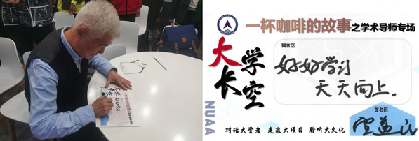 活动结束时,宣益民与同学们合影留念。他还亲笔给同学们留下了寄语:“好好学习,天天向上。”本次活动是长空学院新学期首场“一杯咖啡的故事”师生交流活动,同时也是知名教授与青年学生分享成长经历、共话科学精神和人文素养的校园文化品牌。今后,长空学院将继续邀请各领域的知名教授做客“一杯咖啡的故事”,助力长空学子成长成才。