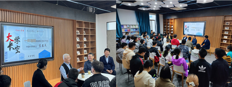 10月5日下午,中国科学院院士宣益民教授到访长空学院,做客“一杯咖啡的故事”师生交流座谈会,长空学院五十余名学生及全体教职工参加了本次座谈会。长空学院常务副院长蒋彦龙、副院长张林、能源与动力学院副院长刘向雷陪同参观交流。