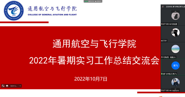 10月7日,通用航空与飞行学院2022年暑期学生下厂实习工作总结交流会在线上召开。江苏无国界航空技术有限公司副总经理张玉、校企合作部主任彭建权、教员苏华,通用航空与飞行学院副院长司海青,安全工程系教师王海飞、方光武,以及全体2019级交通运输(民航维修工程)专业学生参加了会议。会议由王海飞主持。