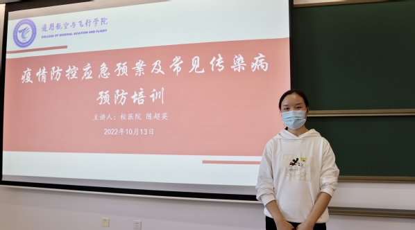 为有效预防传染病的发生,全面提高学生自我防护意识,10月13日下午,通用航空与飞行学院邀请校医院陈超英医生为学院作 “校园疫情防控应急、乙肝和肺结核预防”专题讲座。学院党委副书记魏慧冬,全体辅导员以及2022级学生代表参加讲座。