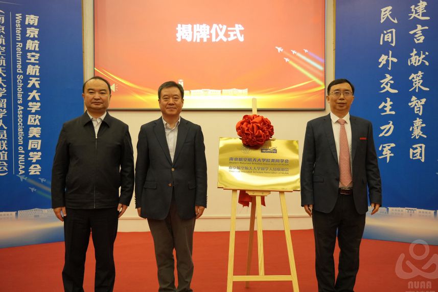 朱军宣读了《关于同意成立南京航空航天大学欧美同学会(南京航空航天大学留学人员联谊会)的批复》,以及会长、副会长、秘书长、副秘书长选举结果。与会领导共同为南京航空航天大学欧美同学会(南京航空航天大学留学人员联谊会)(以下简称“欧美同学会”)揭牌。省政协委员、九三学社南航委员会主委阮新波代表民主党派基层组织、统战团体致辞。校留学人员代表、1990级校友、加拿大航空学院院长凌海铭致贺词。