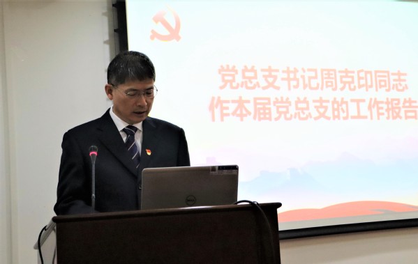 图书馆党总支书记周克印代表图书馆党总支第三届委员会向大会作了题为《踔厉奋发,积极进取,为实现图书馆高质量发展而努力奋斗》的工作报告。周克印在报告中对第三届党总支委员会过去四年的工作和经验进行了回顾总结,对今后的工作目标和任务进行了明确和梳理。他指出:过去的四年中,图书馆党总支在学校党委的正确领导下,认真落实部党组决策部署和校第十六次党代会精神,充分发挥党总支的政治核心作用,紧紧围绕学校及图书馆的中心工作,在智慧图书馆建设、资源建设、图情专业建设、信息服务等方面,都取得了长足的进步并得到快速稳步发展。面对新形势和新任务,图书馆今后要以“服务教学、融入科研、支撑学科”为发展理念,以建设“一流环境、一流资源、一流管理、一流服务”的智慧型图书馆为发展愿景,科学谋划、持续稳步落实图书馆“十四五”发展规划。努力将图书馆建设成为特色和优势明显、综合实力达到国内一流的高校图书馆。