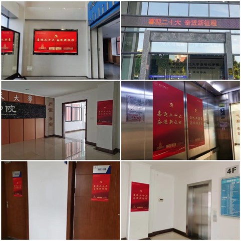 氛围营造方面,自动化学院通过布置“喜迎二十大奋进新征程”主题海报、电子屏、学院网站等在学院内营造了迎接党的二十大胜利召开的浓厚气氛。