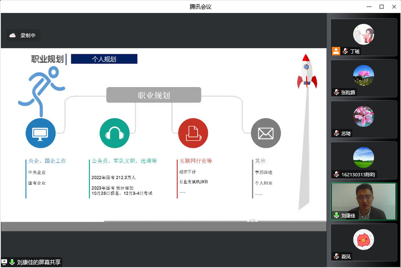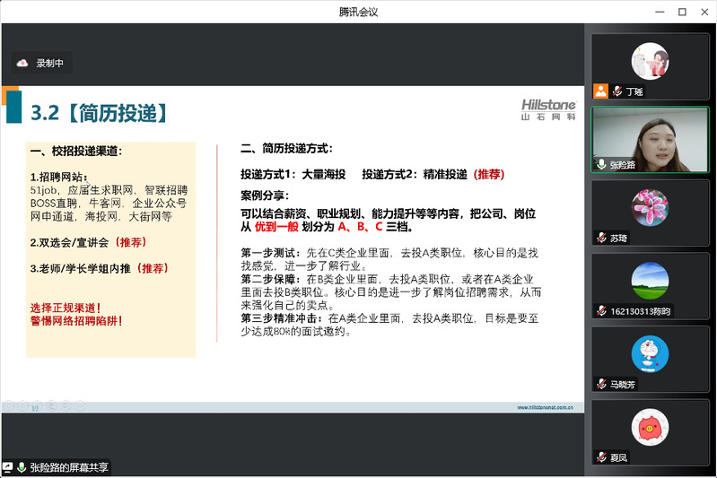 为推动学院毕业生就业工作深入开展,帮助同学们明确就业规划,10月13日晚,计算机科学与技术学院/人工智能学院/软件学院“职”击未来石榴就业“云”指导线上开讲。本次活动邀请山石网科通信技术股份有限公司招聘经理张险路、中国航天科工集团三院三〇四所招聘主管刘康佳就职业规划、面试技巧等方面为同学们进行指导,吸引学院200余名本科生和研究生参加,活动由2020级研究生辅导员丁瑶主持。