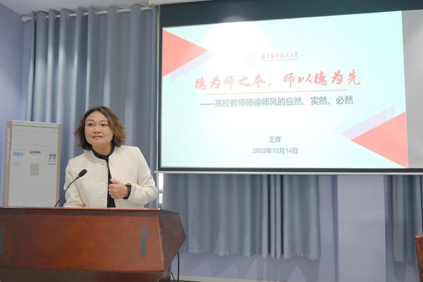 王晖从高校教师师德师风的“应然、实然、必然”三个维度给学院教师上了一堂精彩的思政大课。报告从宏观层面详细解读了党和国家对于师德师风建设的应然要求,从微观层面围绕学科评估指标、“双一流”建设评价体系、人才工程考评指标、教师队伍建设考核指标以及教育部最新出台的相关文件内容等介绍一系列新变化,揭示了师德师风普遍存在的问题,进一步指明强化高校师德师风建设工作的思路、载体和路径。