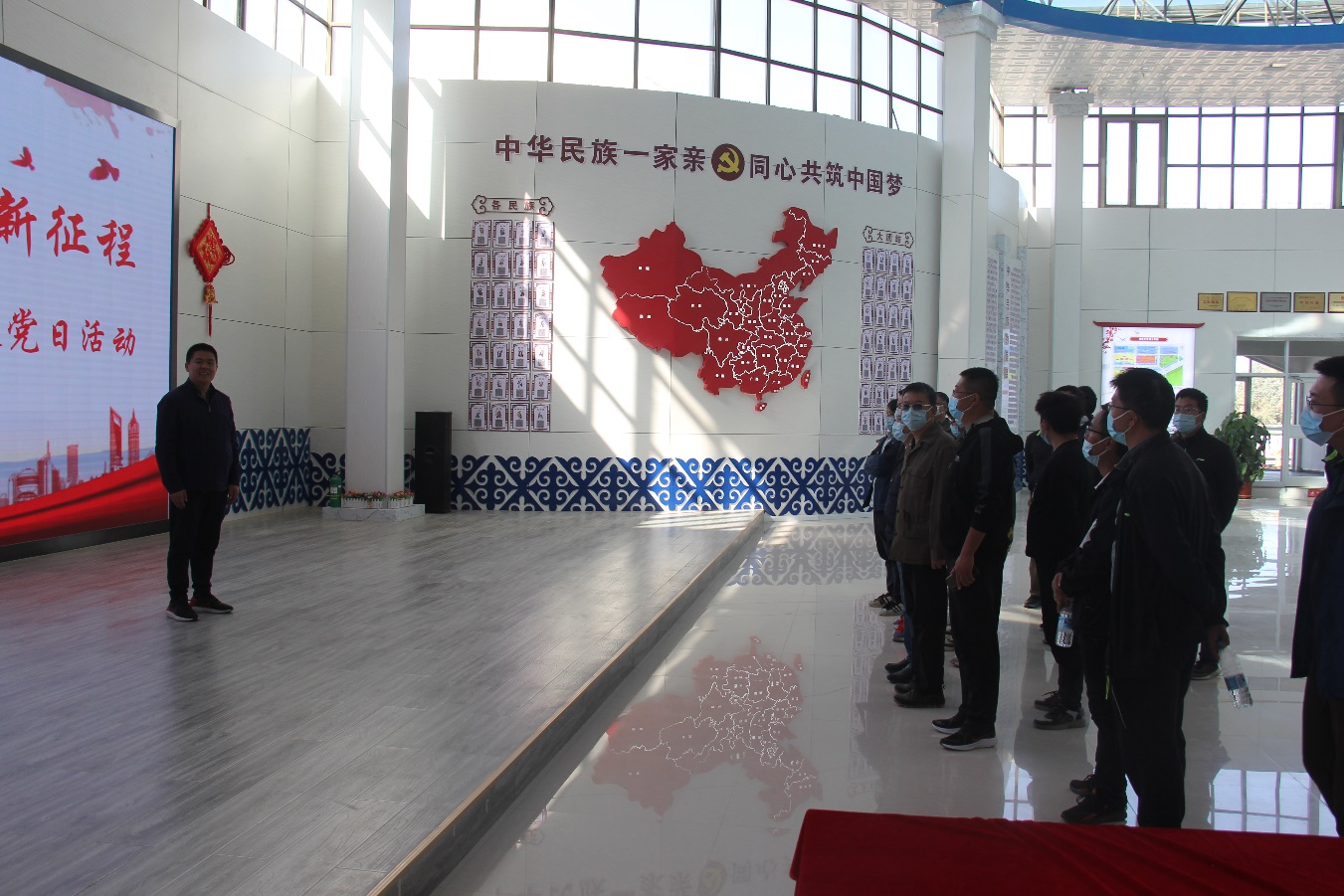 临时党支部一行首先来到阿克塞县金山社区党群服务中心,在社区工作人员带领下学习了《自治区民族团结进步工作条例》,临时党支部书记王洪宪为全体党员讲授《民族团结心向党,攻坚克难谱新篇》专题党课。与会同志做交流发言。
