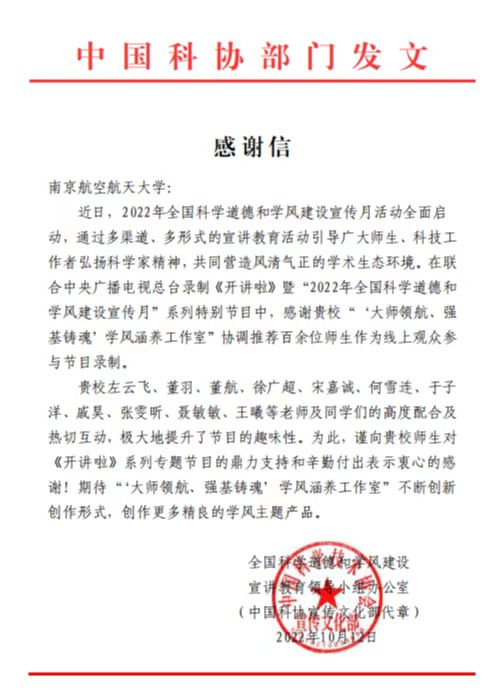 近日,中国科协向我校机电学院发来感谢信,感谢我院在联合中央广播电视总台录制《开讲啦》暨“2022年全国科学道德和学风建设宣传月”系列特别节目中协调推荐百余位师生作为线上观众参与录制节目。同时希望我院“‘大师领航、强基铸魂’学风涵养工作室”不断创新创作形式,不断推出更多精良的学风主题产品!