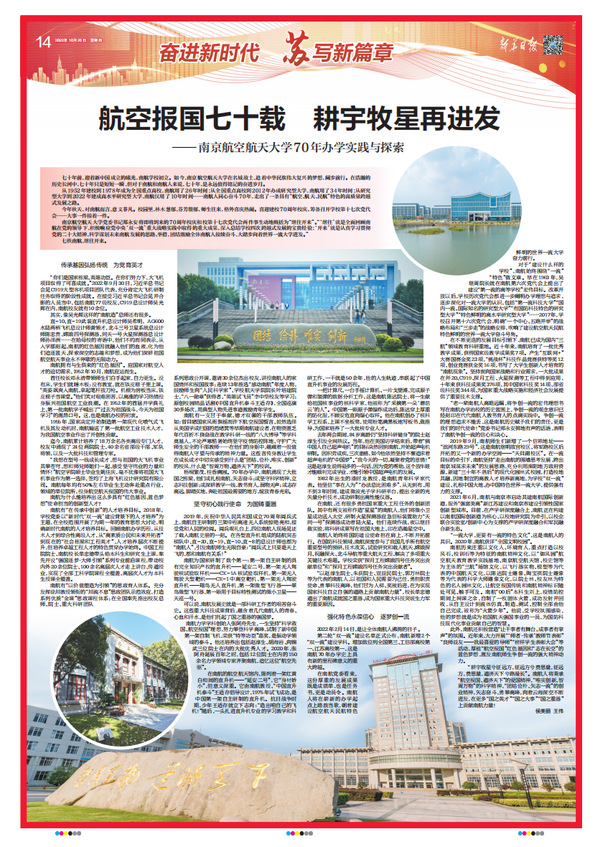 编者按:2022年10月20日,《新华日报》整版刊载文章《航空报国七十载 耕宇牧星再进发—— 南京航空航天大学70年办学实践与探索》,回顾我校建校70年以来的办学实践,取得的发展成就。现转发全文如下: