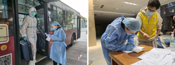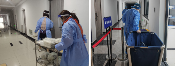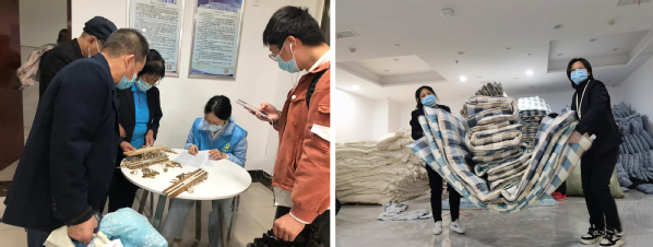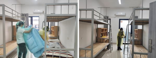 公寓服务中心安排两校区办公室骨干紧急做出保障预案,合理调配房源,计算可用房间和床位数,按照名单排出房号,准备床上用品,完成200余间宿舍的卫生保洁和设施配置,解决了两校区住校保障人员的住宿需求,发放439套床上用品,直到深夜零点,两校区依旧在接待住宿保障员工。疫情之下,外专楼医学观察点进入高负荷运转,根据要求流调、次密接、黄码、轨迹交叉、省外零散返校的师生全部需要进行核酸检测以及医学隔离观察。隔离点的公寓员工为需要医学观察的师生办理入住,一趟又一趟为师生送去各类生活物品,协助校医院医生逐间扫码做核酸。10月17日至18日,外专楼医学观察点共接待入住师生268人,天气渐冷,员工一次次上楼下楼,大家的衣服已被汗水浸湿。