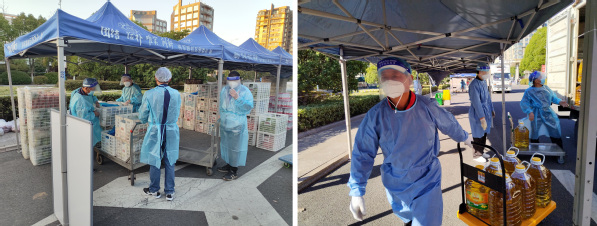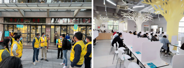 为确保管控期间在校师生一日三餐不受影响,饮食服务中心两校区共计620名员工住校保障。由于食品原材料不能直接入校,食堂员工每天凌晨5:30到校门口装卸、转运物资,每天转运总量约9万斤。为落实间隔就座要求,加班加点给食堂餐桌安装上隔板;为避免就餐高峰期拥挤,在食堂入口处增设隔离栏;招募师生志愿者,投入食堂出入口值守和就餐引导,提醒就餐师生遵循各项防疫举措。集团党员积极支援食堂,早中晚三个时段准时来到餐厅,帮助维持防疫秩序,做好师生就餐引导,为打赢疫情防控阻击战贡献力量。