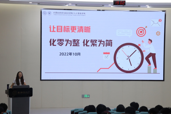 为了帮助学生合理规划大学时间,扎实培养专业能力,尽早明确职业发展路径,10月21日晚上19:00,计算机科学与技术学院/人工智能学院/软件学院在天目湖校区牧星楼报告厅召开了“化零为整 化繁为简——让目标更清晰”主题公开月讲评,2021级本科生辅导员韩桂馨担任主讲人,400余名2021级本科生到场参加。