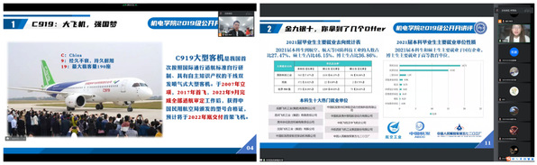 为切实增强同学们的历史使命感和民族自豪感,帮助同学们了解我国国防单位的情况,进一步加强同学们对当前就业形势的认知,提高同学们的就业能力,2022年10月24日19点,机电学院本科2019级以线上年级会的形式召开“按下就业提速键,C919飞上天”主题公开月讲评。2019级全体本科生参加本次月讲评,月讲评由2019级本科生辅导员于子洋和何雪连主讲。