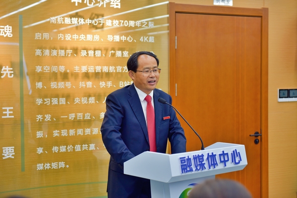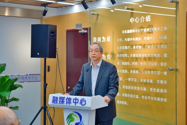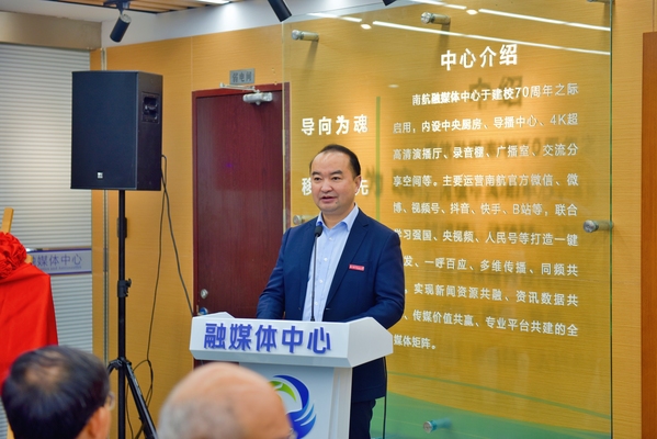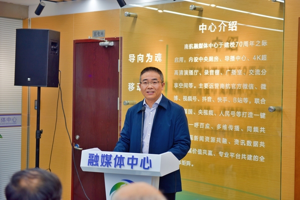 陶勇介绍了学校融媒体中心的建设背景,他表示,学校融媒体中心建设始终与国家部署同频共振,全力构建一次采集、多种生成、多元传播系统,聚力打造一键齐发、一呼百应、多维传播的传播格局,着力建成主流舆论阵地、综合服务平台、信息传播枢纽和精神文化家园。他向参与融媒体中心规划建设的校内外单位表示衷心感谢,指出学校将以融媒体中心启用为契机,积极响应中央要求,不断学习先进经验,用心回应师生诉求,开拓“融媒+思政+服务”的治理新路径、育人新模式,为建设航空航天民航特色鲜明的世界一流大学做出新的更大贡献。