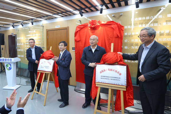 学校融媒体中心与新华社江苏分社全媒体报道中心、中电莱斯网信技术研究院合作共建,旨在共同打造平台互联互通、资源共建共享的高校融媒建设新样板,黄志球与鲁士仿为“融媒体大数据应用基地”、施大宁与张展鹏为“践行‘四力’实训基地”揭牌。