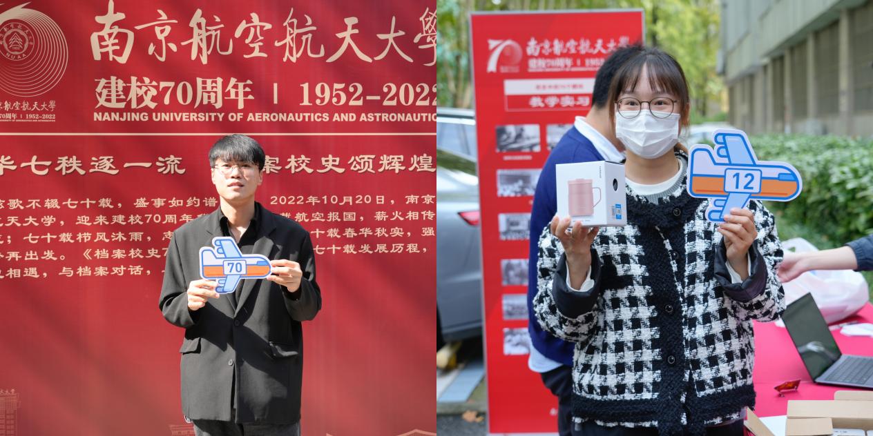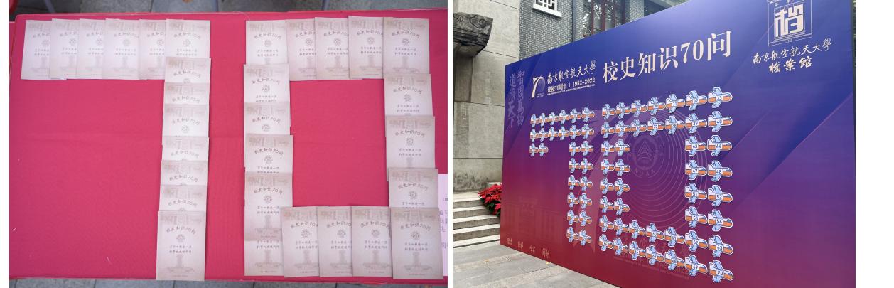 本次活动分为校史知识竞答和图片展览两部分。70架印有校史题目的小飞机拼接成数字70的图案,寓意着“问天七秩 逐梦一流”。题目内容涵盖学校发展历程、人才培养、科学研究、党建引领四大模块,全方位促进师生员工对南航建校历史的了解。图片展从学校校史上的首次、科学研究、毕业合影等维度带领大家一起回顾南航筚路蓝缕、白手起家、经过70年的跨越式发展成为高水平研究型大学的过程,展现出一部南航人负重奋进、志在超越的辉煌历史。