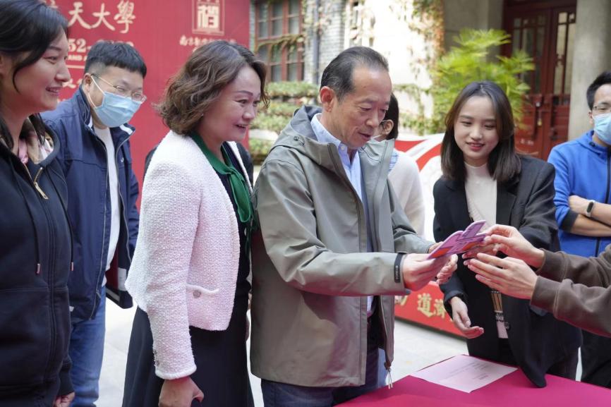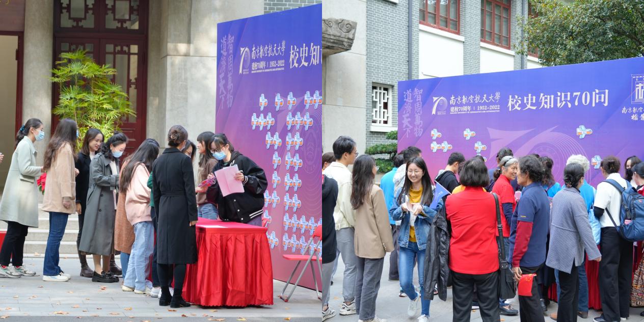 活动开始,大批教工、学生驻足观看并积极参与,现场气氛热烈。参赛师生自主选择题目编号并答题,回答正确即可参与抽奖。现场还为参与师生发放了《校史知识70问》学习手册,供师生深入了解学习南航七十载发展历程。