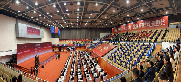 体育馆前“为党育英才,为国铸重器,为以中国式现代化全面推进中华民族伟大复兴作出更大贡献”的大幅红色横幅庄重醒目、激荡人心。