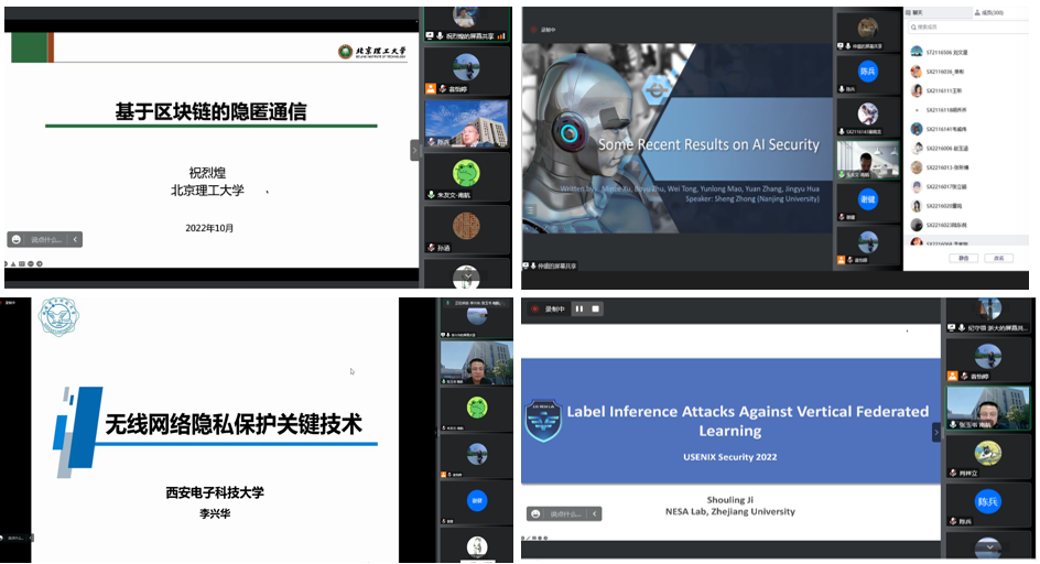 祝烈煌教授介绍了区块链赋能隐蔽通信和匿名通信的优势和挑战,并对基于区块链的隐蔽通信技术以及基于区块链的匿名通信技术进行了探讨。仲盛教授分析了人工智能技术的迅速发展带来的众多安全问题,对围绕着与机器学习紧密相关的几个安全问题及其研究进展进行了深入分析。李兴华教授介绍了无线网络隐私保护的背景、隐私保护需求与总体架构,并详细介绍了其团队在无线网络隐私保护方面所做的工作。纪守领教授介绍了纵向联邦学习所面临的隐私安全风险,提出了标签推断攻击,并探讨其防御方法。