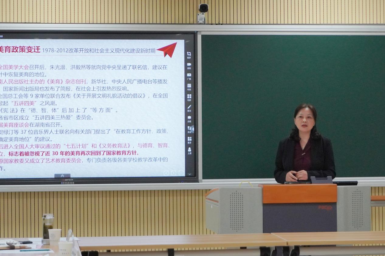 艺术学院党委书记张钟勤以“建党百年美育政策变迁及美育政策”为题,进行了主题报告。她从建党百年以来党的美育政策的变迁入手,介绍了1921年以来党的美育政策的主要内容、特点、和代表性作品,使与会人员全面了解了党的美育政策的发展历程,充分认识到党对于美育工作的重视。张钟勤详细解读了党中央、国务院发布的《关于全面加强和改进新时代学校美育工作的意见》,并结合学院开展美育工作实践,提出加强学校美育工作的四点思考。一是强化政策制度保障,凝聚工作合力;二是强化分层分类设计,丰富课程资源;三是强化课内课外衔接,深化美育实践;四是强化专业交叉融合,改革培养模式。