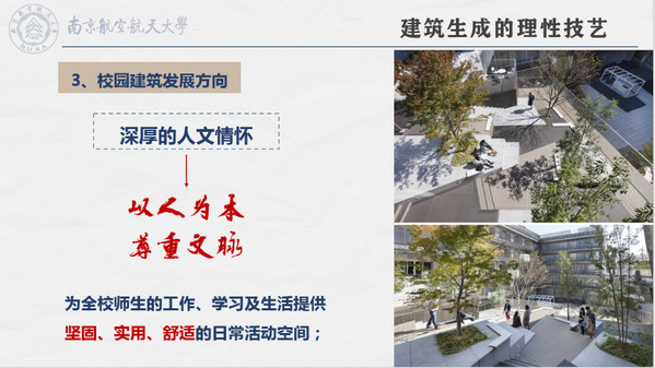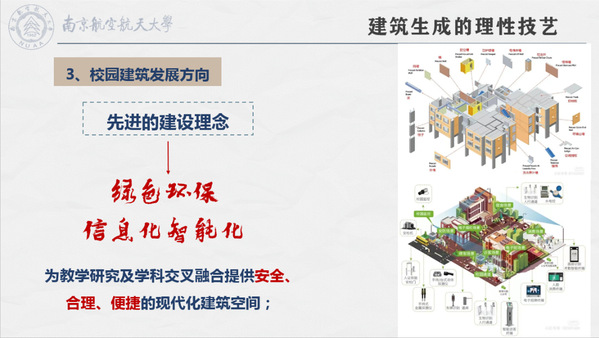 空间是建筑的灵魂,行为是师生的交互。张易文用一张图片启发大家思考空间与行为之间的相互影响,从校园分区与布局、校园空间与行为、校园风格与文脉,阐释了校园规划与师生行为之间的关系,以及文化传承在各阶段校园规划中的不同体现;通过南航建筑象征分析、各类校园建筑赏析,带领大家共同领略了校园建筑中的人文情怀;从设计的重要性、施工的严谨性、协作的综合性描绘了建筑生成的全过程。她介绍,未来的校园建筑发展方向,将持续做到以人为本、尊重文脉,从绿色环保、信息化、智能化等多方面进行探索,致力于为师生日常生活、学校教学科研提供安全、合理、舒适的建筑空间。