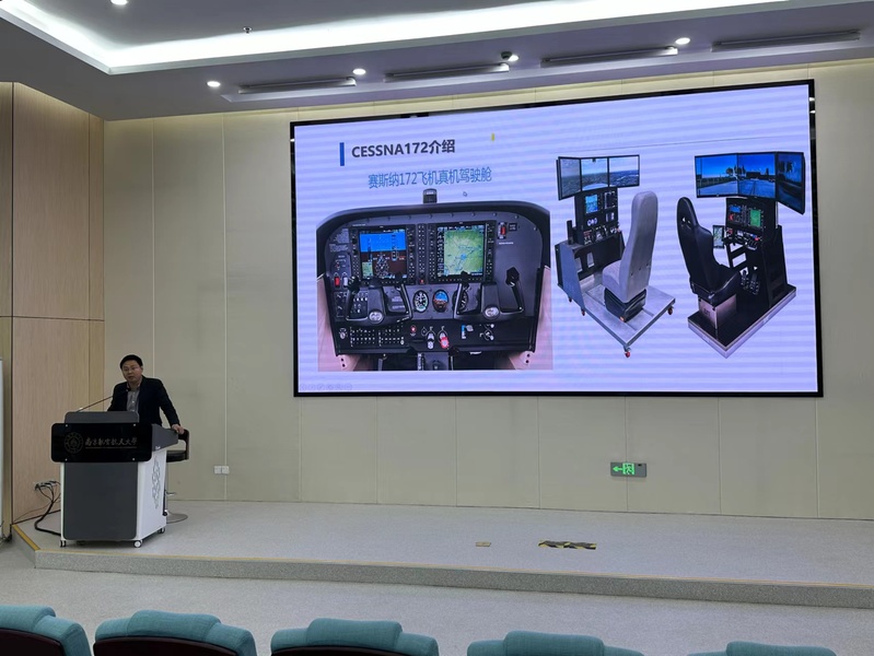 蔡中长老师首先对模拟飞行大赛的赛事历史、竞赛训练场地和设备、赛事计划等情况进行了详细介绍,并为同学们讲述了模拟飞行队自2017年建成之初一路披荆斩棘荣获佳绩的奋斗历程,鼓励同学们积极进取,接过学长们的接力棒再创辉煌。此外,蔡老师还展示了部分实验室的模拟教学设备,从初级模拟机到塞斯纳172、DA-40全真模拟机,仿真程度也更贴合实际训练需求,无论是为平时专业知识的积累还是为日后航校实训实践,都有助于学生打下坚实的基础。