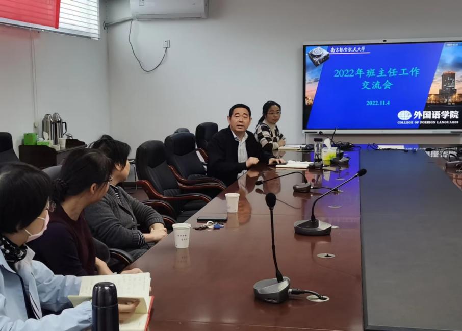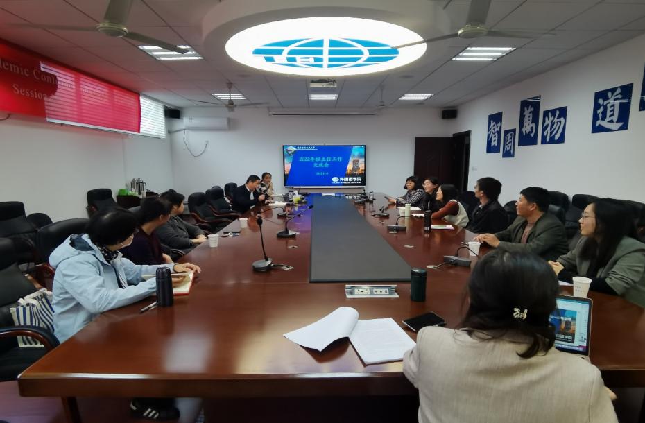 为做好服务育人工作,充分发挥班主任在学生成长成才中的引领作用,11月4日下午,外国语学院在322会议室召开本科生班主任工作交流会。副院长徐以中教授、英语系主任张立新教授、日语系主任窦硕华副教授、英日语系党支部书记钟勇副教授、教学办主任黄潜、各位本科生班主任参加会议。