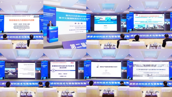 在复合材料技术与装备国际发展论坛上,中国中车集团有限公司副总裁王军、中国航发沈阳发动机设计所总设计师刘永泉、杜伊斯堡-埃森大学(University of Duisburg-Essen)教授Stephan Barcikowsk、卡迪夫大学(Cardiff University)教授Rossi Setchi、北京理工大学教授王西彬、哈尔滨工业大学教授赫晓东、不来梅大学(University of Bremen)教授llya Okulov、南京玻璃纤维研究设计院有限公司标研院副院长马丹、常州新创航空科技有限公司设备工装部部长陈云9位专家分别围绕碳纤维复合材料在轨道交通装备技术革新中的应用、航空发动机轻质化材料应用、多相态复合材料高效低损伤加工技术、先进复合材料制造中的基础问题与挑战、我国碳纤维及其复合材料标准化工作进展与发展趋势、热隔膜自动化预成型技术研究等主题开展了学术报告和交流研讨,充分展示了新一代复合材料技术与装备的发展现状和未来趋势。