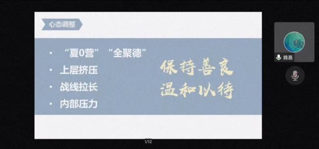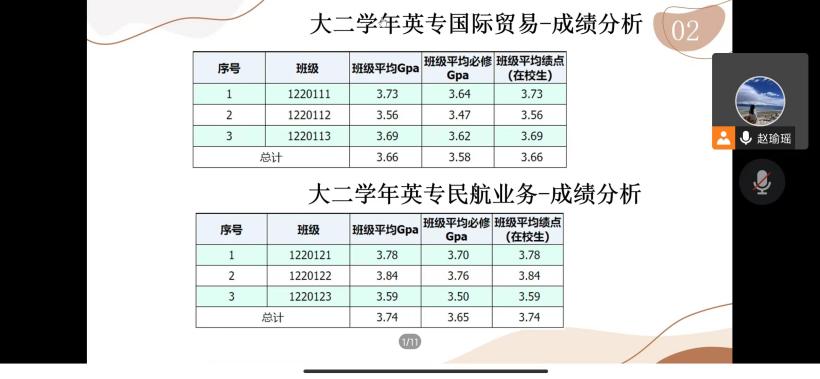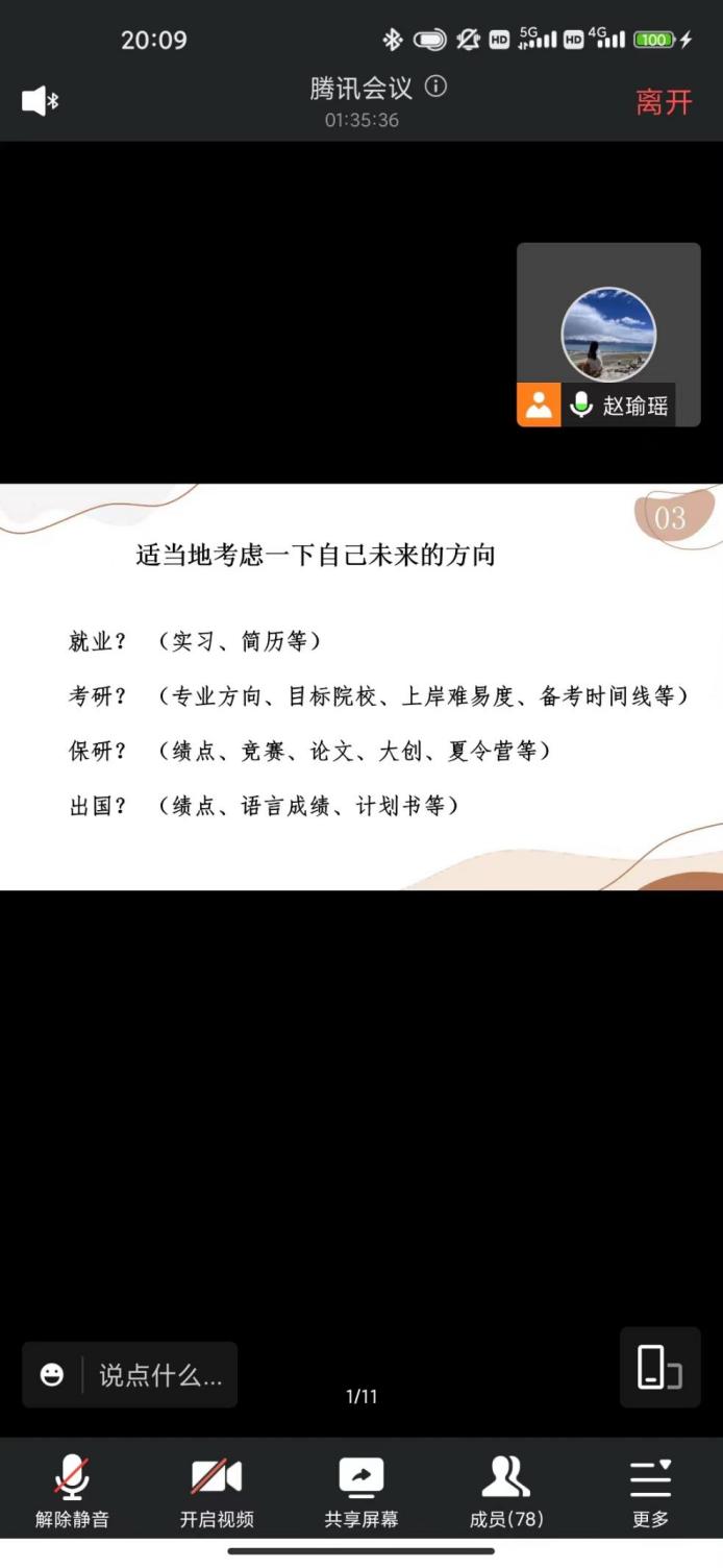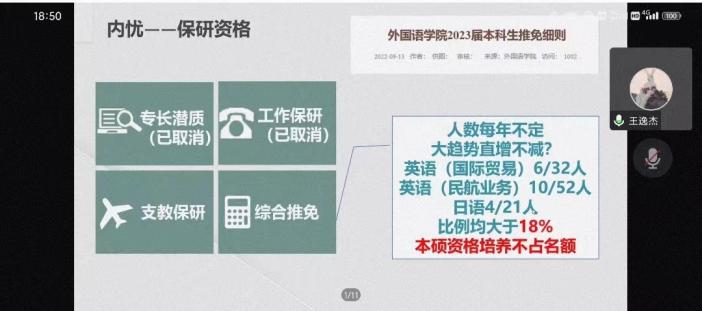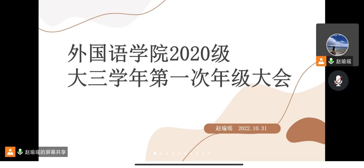 为激发学生学习主动性,回顾总结上一学年的学业成绩,10月31日晚上,外国语学院开展了线上2020级本科生学业分析年级会暨保研分享会,会议由辅导员赵瑜瑶主持。