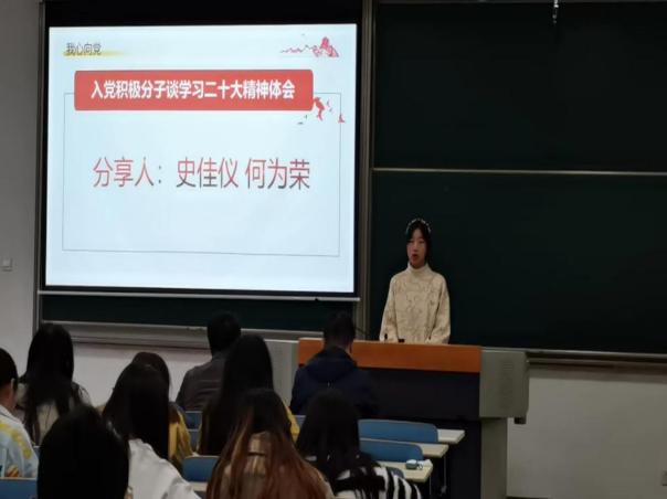 在积极分子分享交流环节,入党积极分子代表史佳仪、何为荣分别结合自己近期理论学习、社会实践、志愿服务情况分享了学习体会与心得。