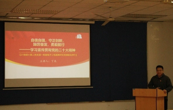 在党的二十大召开和七十周年校庆之际,为深入学习宣传贯彻党的二十大精神,在新征程上谱写新篇章,机电学院机械电子工程系党支部与21级硕士研究生第二党支部于6201会议室联合召开“回溯七十载,展望新征程”联合学习活动。活动邀请到机电学院退休教师雷玉亮教授和郑叔芳教授作为特别嘉宾,活动由2021级硕士第二党支部副书记阮思宇主持。