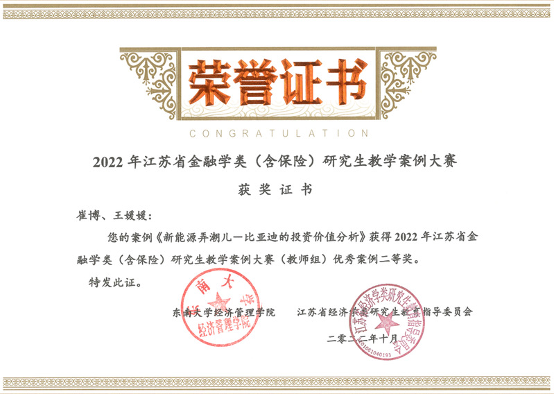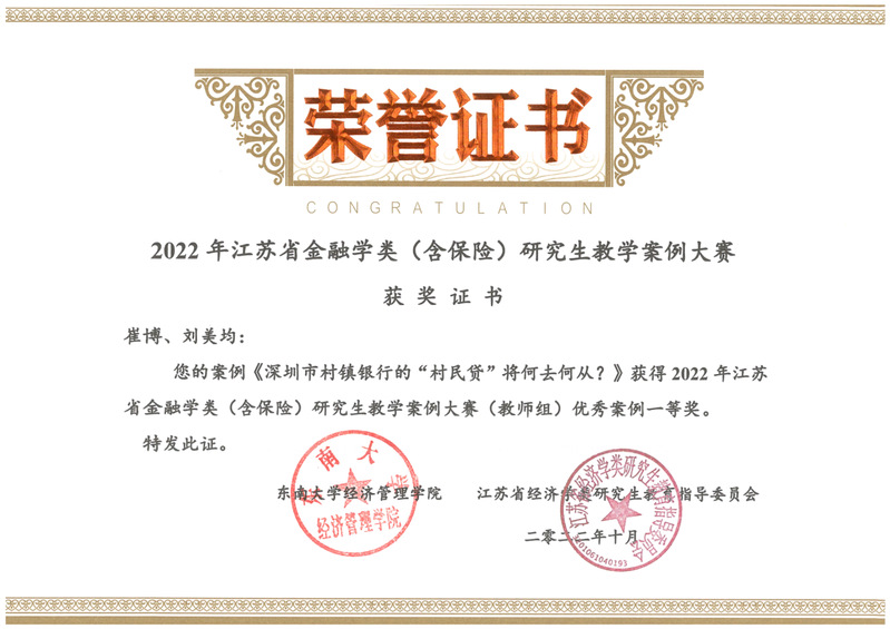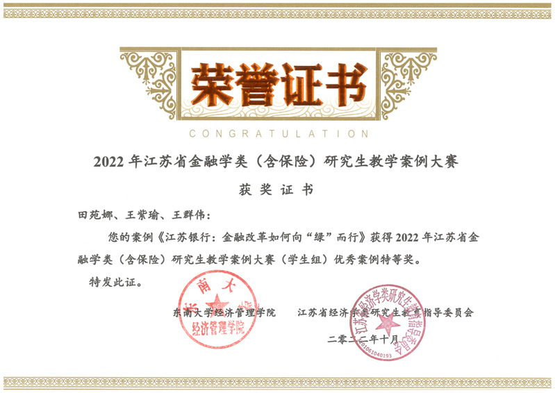 近日,江苏省经济学类研究生教育指导委员会公布了2022年江苏省金融学类(含保险)研究生教学案例大赛评选结果。经过大赛组委会通讯评审、专家会评、线上答辩等环节,经济与管理学院师生在此次大赛中取得佳绩,并斩获特等奖1项、一等奖1项、二等奖1项。