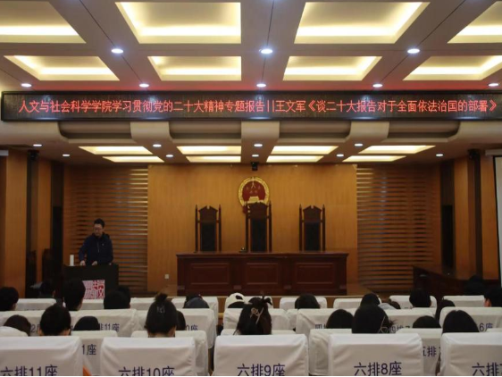 会后,学习贯彻党的二十大精神宣讲团成员、学院法律系系主任王文军教授开展了题为“谈二十大报告对于全面依法治国的部署”的主题讲座。刘思辰对参加学习的学生党员及积极分子、发展对象做了认真学习宣传贯彻党的二十大精神动员,她希望学生党员、学生干部要主动学、带头学,还要联系实际学,要坚持学思用贯通、知信行统一,把党的二十大精神落实到学习生活的各方面,体现到实习实践的过程中。