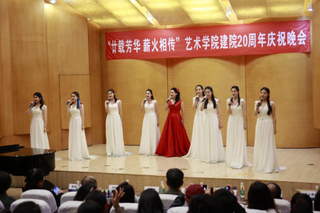 晚会以“廿载芳华 薪火相传”为主题,通过钢琴独奏、舞蹈、合唱、诗朗诵等形式的精彩演绎,讲述了艺术学院二十年来不忘初心、矢志奋进的成长历程。二十年来,艺术学院始终践行“学立、道通、艺致”的院训,坚持“艺工融合、双向驱动”的发展路径,遵循艺术类学科专业的发展规律,积极服务学校校园文化建设和全校师生艺术素养提升。