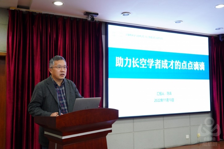 计算机科学与技术/人工智能/软件学院院长陈兵教授作为学院代表发言,分享了学院对于青年人才的培养心得与实践经验。他表示学院始终关注并积极探索青年人才培养途径,通过有速度、有温度、有精度的管理,依托优质培养体系、学科特色活动、专用实验平台等全方位助力长空学者成才。