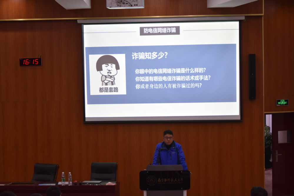 讲座着重讲解了当前关注度较高的“电信诈骗”,此“诈”有 “损失大、套路多、范围广”的特点,严重损害受害人的财产安全。黄超峰从诈骗的产生过程讲起,以学校中的真实诈骗案例阐述“学历高也会被骗”的教训,提醒同学们提防各类诸如“熟人诈骗、刷猪盘、刷单返利”等的电信诈骗。最后,黄超峰要求同学们务必下载“国家反诈中心”APP,将电信诈骗的威胁拒之门外,并教授了许多遭遇诈骗时实用的解决办法。