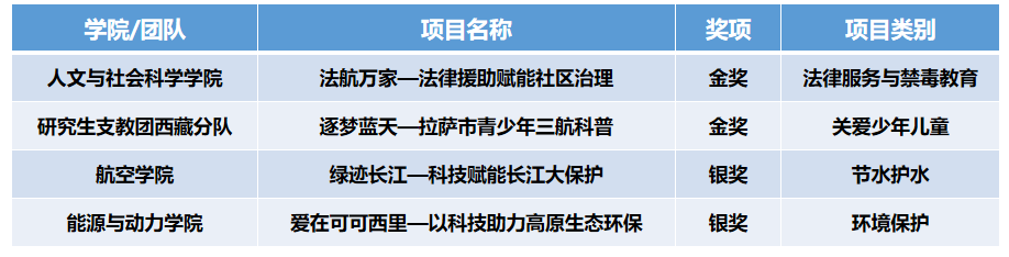 近日,第六届中国青年志愿服务项目大赛暨志愿服务交流会竞赛结果揭晓。我校人文与社会科学院“法航万家—法律援助赋能社区治理志愿服务项目”、研支团西藏分队“逐梦蓝天—拉萨市青少年三航科普志愿服务项目”荣获金奖;航空学院“绿迹长江—科技赋能长江大保护志愿服务项目”、能源与动力学院“爱在可可西里—以科技助力高原生态环保志愿服务项目”荣获银奖。这是自我校参与该大赛以来,首次获得金奖荣誉,实现在获奖奖项与数量上双突破。