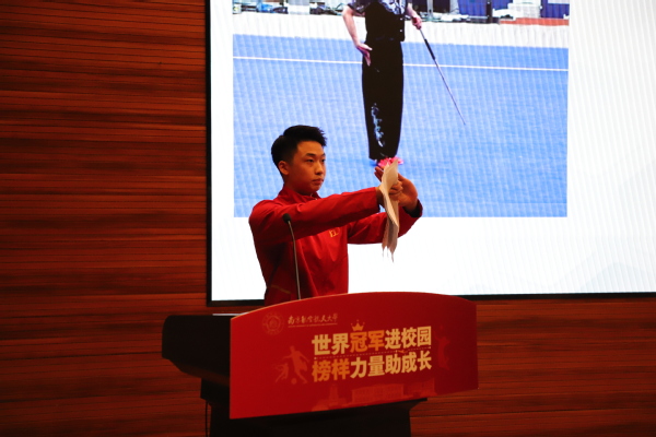 第十五届世界武术锦标赛武术套路男子刀术冠军、第十四届全运会男子长拳、刀术、棍术全能冠军吴照华,分享了他《从“武侠梦”到“冠军梦”》金牌背后的成长故事,讲述了自己选定项目、坚定理想、克难攻坚、实现梦想和在比赛中当勇者、强者和智者的冠军之路。他最后总结,不是成功者爱做梦,而是善梦者才会成功。