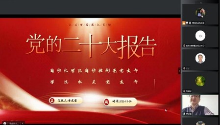 2022年11月24日下午,为了深入学习贯彻党的二十大会议精神,自动控制系党支部和机关党支部采用线上、线下相结合的形式在自动化学院403会议室开展了联合党课学习和交流活动,该活动由自动控制系党支部书记曾庆化和机关党支部书记王俊彦联合主持。自动化学院党委书记李文雷讲授党的二十大报告精神专题党课。