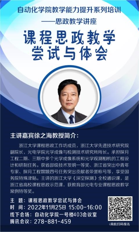 2022年11月25日下午,学院邀请到浙江大学教授徐之海作题为《“课程思政”教学尝试与体会》的线上专题讲座。本次讲座由自动化学院副院长魏佳丹主持,学院党委书记李文雷、院长陈谋、各系所中心教学副主任、近三年入职青年教师和教学办全体老师出席活动。讲座采取线上、线下相结合的方式,全校50余名专任教师听取了报告。