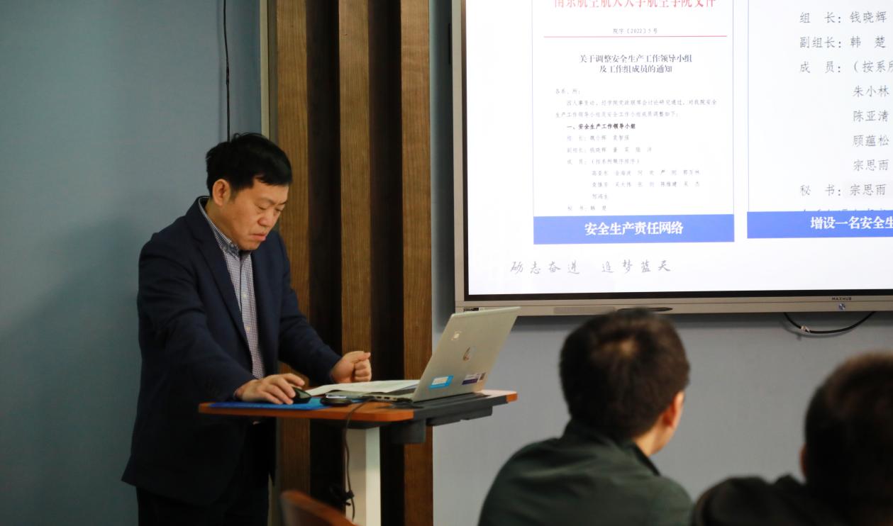学院党委书记袁智强从安全工作总体情况、专项巡察整改落实情况、下一步举措三方面对学院安全发展情况作了详细汇报。他指出,自上半年学校开展安全发展政治责任专项巡察以来,学院围绕巡察整改制定整改台账,确定整改任务和主要措施50项,人机环境实验室等重点场所开展了分区调整和安全环境整改,目前均已完成初步整改。