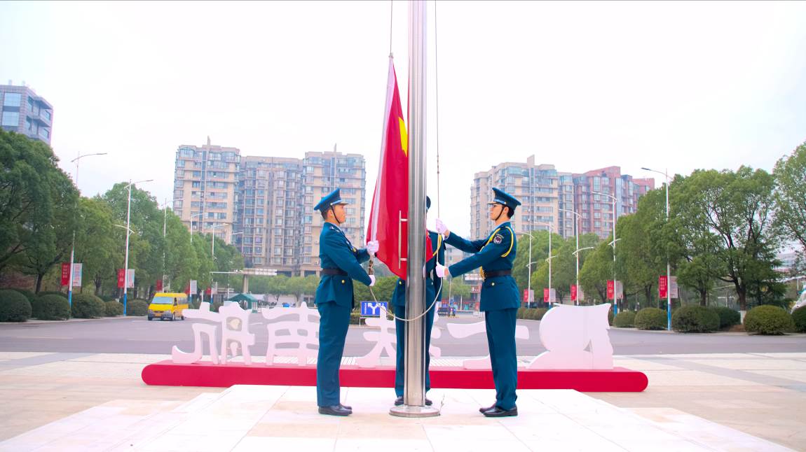 早上7时,国旗护卫队将国旗护送至升旗台。伴随着庄严的国歌,五星红旗冉冉升起,迎风飘扬。观礼师生全体肃立,向国旗行注目礼。