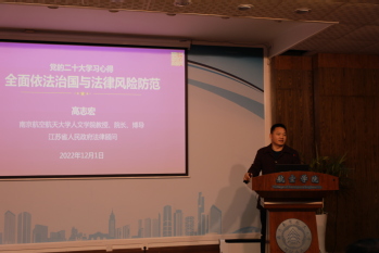 12月1日下午,航空学院党委在A18-529报告厅举行学习贯彻党的二十大精神校内宣讲会。校宣讲团成员、人文学院院长高志宏教授应邀为学院师生做了题为《全面依法治国与法律风险防范》的二十大学习心得宣讲。学院党委书记袁智强主持会议。院党委理论中心组成员及师生支部书记、党员代表等90余人参加了宣讲会。