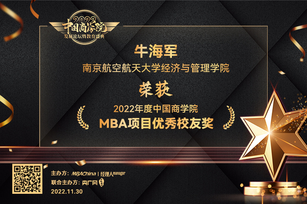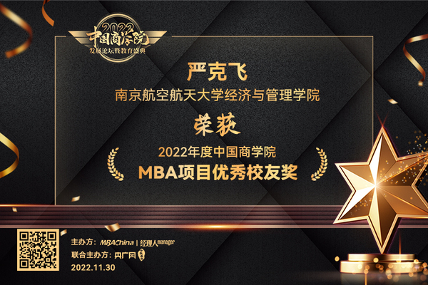 2022年11月30日,MBAChina与《经理人》杂志、央广网联合主办的“2022年度中国商学院发展论坛暨教育盛典”在北京落下帷幕。本次论坛邀请了全国知名专家学者进行主题分享,探讨新型商科人才培养模式,共同传递商学院成长力量。“2022年度中国商学院暨MBA项目系列榜单”在本次盛典中相继揭晓,南京航空航天大学经济与管理学院MBA项目凭借强劲的实力和鲜明的特色,斩获多项荣誉。