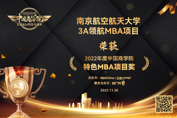 南京航空航天大学3A领航MBA项目(聚焦于航空、航天、民航领域Aeronautics,Astronautics and Civil Aviation,简称“3A”)荣获“中国商学院特色MBA项目奖”。