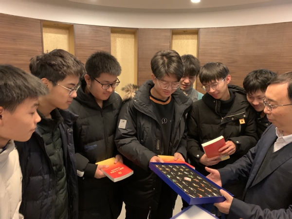 交流后,姜斌为同学们送上精心准备的三件礼物,一是《党的二十大报告学习辅导百问》,他启发同学们要认真研读党的二十大报告原文,学习报告精神、汲取成长力量,并相约下次进行学习情况交流分享。二是为同学们带来了南航校庆纪念版飞行器徽章,他表示同学们见证了南航的荣光时刻,勉励同学们爱校荣校,传承南航精神,珍惜学习机会,在南航的热土上奋进成长。三是一份充满浓浓爱意的暖冬大礼包,叮嘱同学们注意生活规律,期末好好复习,争取取得理想成绩。